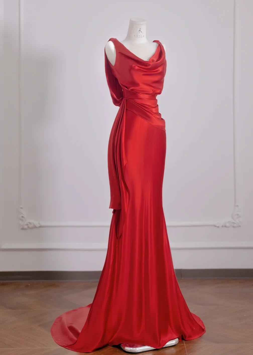 Beautiful Red Satin Mermaid Open Back Long Prom Dresses Elegant Evening Gowns HZ1108