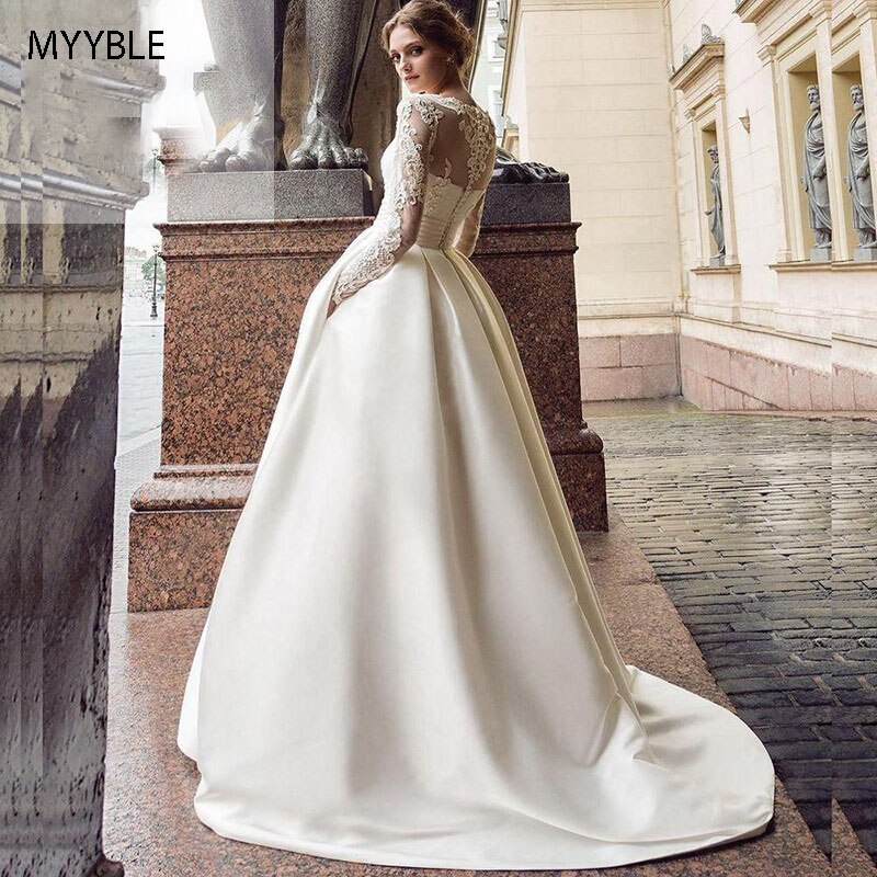 2023 vestido de Novia de manga larga modesto vestido de Novia de satén con apliques de línea a con bolsillos Vestido